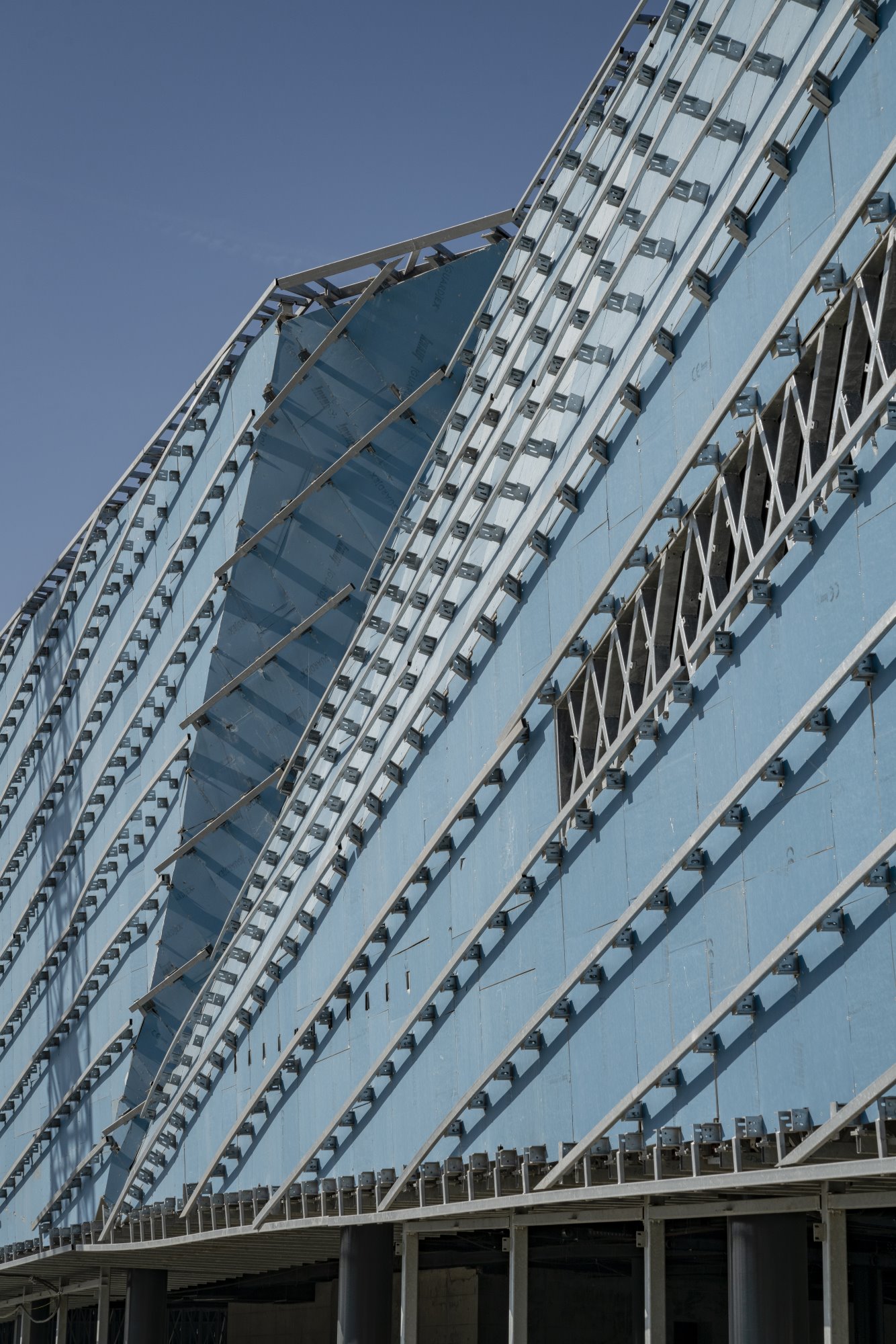 The monolith that houses the museum floor is developed from the alignment of the entrance axis and the visitor route movement inside the exhibition. The visitors enter through a giant crack, as if they are walking through an archaeological ruin. The multifaceted facade, composed of anodized metal and glass, seeks for a dialogue with the multilayered Theodosian Land Walls. Developed through computational design, using a custom algorithmic script, the facade is composed of a unique, mass customized panellisation pattern that creates the sense of a fragmented monolith. The facade employs an open joint paneling system with a bespoke finish designed to amplify the sky and colour the building in different hues.